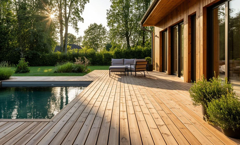 Для «мокрых» зон и открытых территорий рекомендуем палубную доску из долговечных, влаго- и биостойких материалов: термоясеня, термососны, лиственницы. На пол закрытых террас и балконов можно использовать погонаж из сосны и ели.